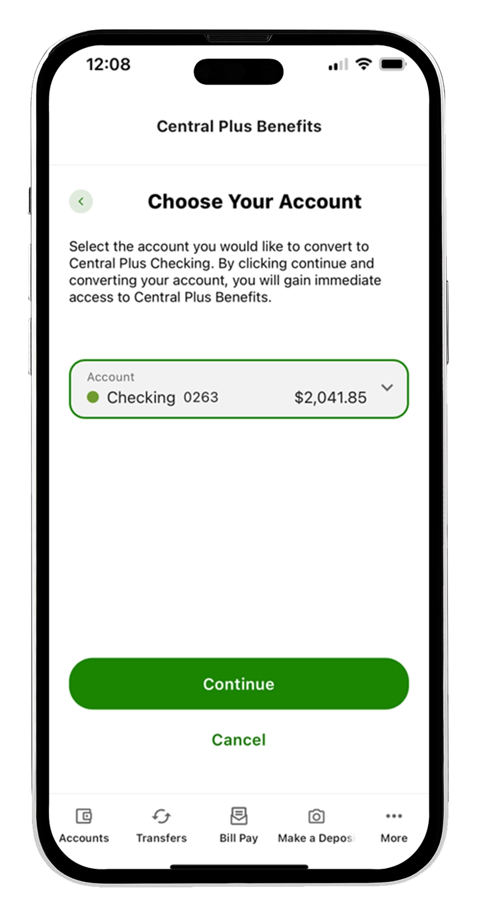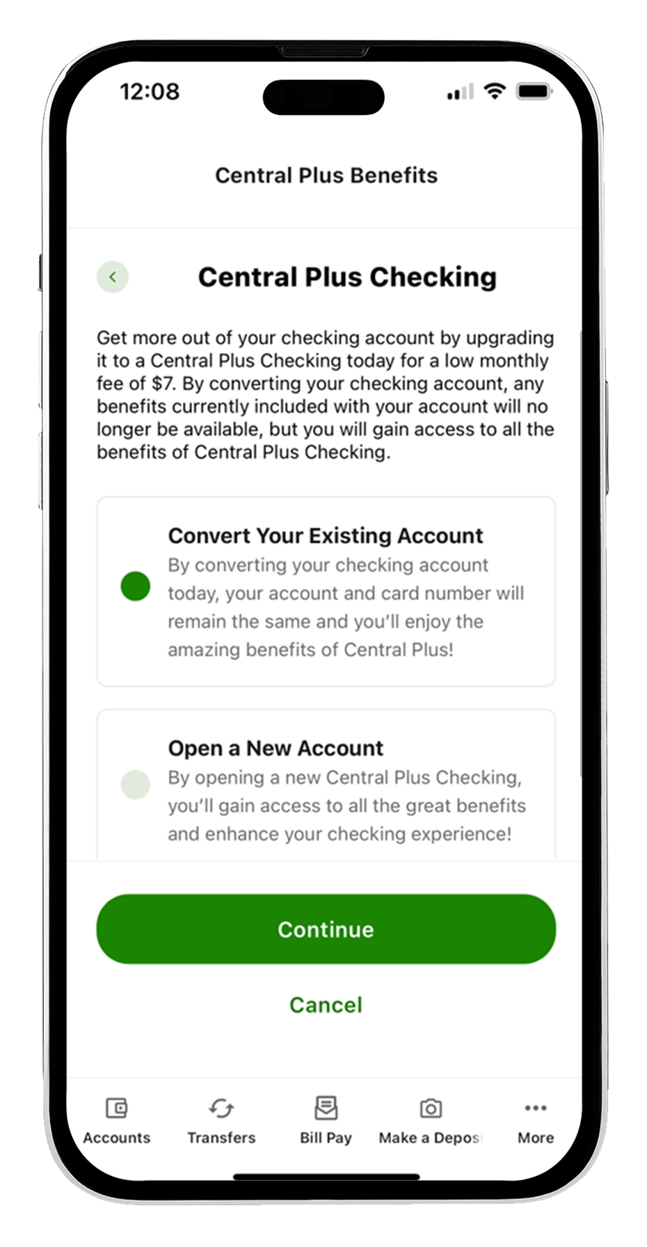 From here, select which account to upgrade to a Central Plus Checking by clicking the dropdown field. Once you have chosen an account select “Continue.”