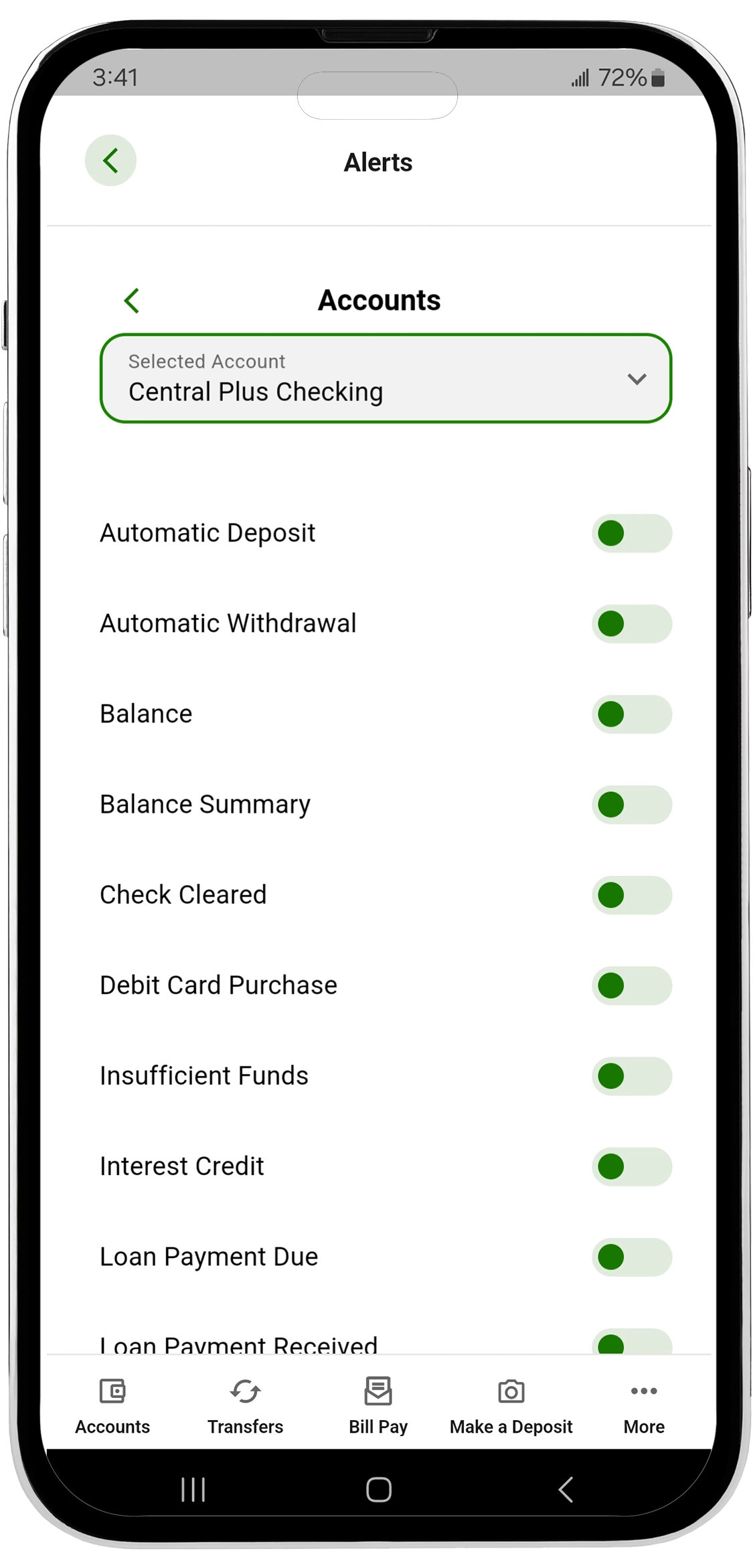 Voilà! You can now successfully customize your Alerts by toggling your desired option on or off for each of your separate accounts.